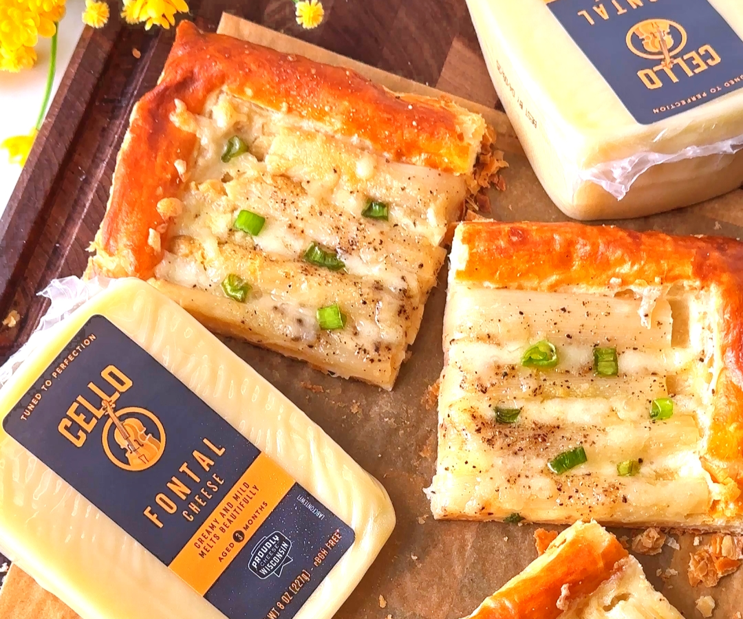 - To assemble the tart, sprinkle the shredded Cello Fontal Cheese evenly over the par-baked pastry base. Arrange the white asparagus spears neatly on top. Drizzle with olive oil and season with salt, black pepper, and onion powder. Top with more cheese and green onions.